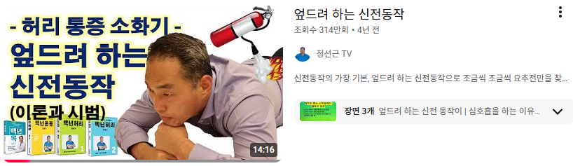 허리 전문가로 유명한 정선근 교수의 유튜브 영상을 보면 '신전운동'이라고 해서 허리에 좋은 운동법을 소개해 놨습니다. 조회수가 수백만 회에 달하고 효과를 보았다는 댓글도 많습니다. 저 또한 이번에 통증이 생겼을 때 신전운동을 따라 했는데, 그 때문인지는 몰라도 다음날 증상이 호전되었기에 영상 공유합니다.